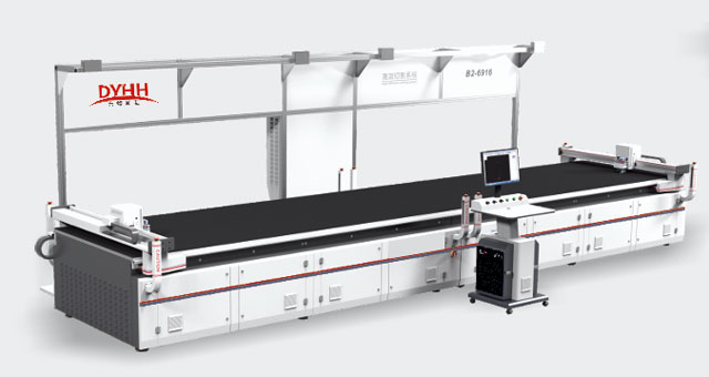 DY -3016S/6616$/160160S Intelligent Cutting Machine is a new generation of efficient and multifunctionalintelligent cutting equipment that integrates high-definition projection, vacuum adsorption and fixation of leatherefficient cutting with dual vibrating cutter heads, and automatic flow channel transmission. The left and right cutterheads can be replaced with different tvpes of cutter bars/tools, and can simultaneously cut different tvpes of naturaleather. lt has two working areas for cutting and receiving, allowing simultaneous cutting and receiving, improvingwork efficiency, lt is an ideal intelligent cutting equipment for large-scale production of leather products enterprises.