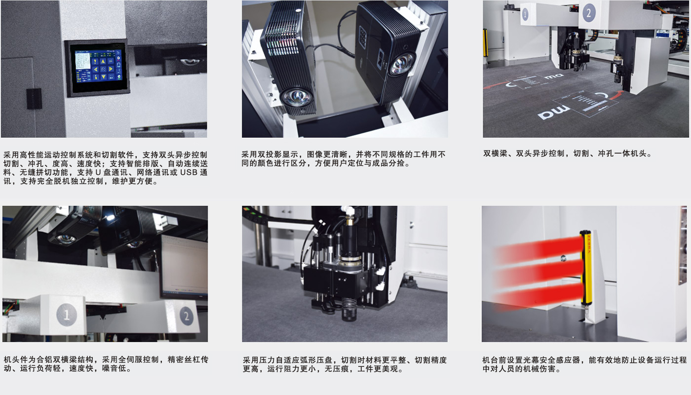 ELS-B13智能裁切加工中心是一款采用高刚性重型机身和精密丝杠传动,双横梁、双头异步控制切制、冲孔于一体的全新一代的高效智能裁切生产线,包含了全自动智能排版、自动连续送料、支持无缝拼切功能、异步同时切割不同形状、断电续切等技术的特点具有运行噪音低、主控芯片运算速度快、切割精度高、省时省料、占用场地少,广泛应用于服装、沙发、数码印花、广告写真、窗帘布艺、箱包、制鞋等行业的工业化大批量智能裁切。