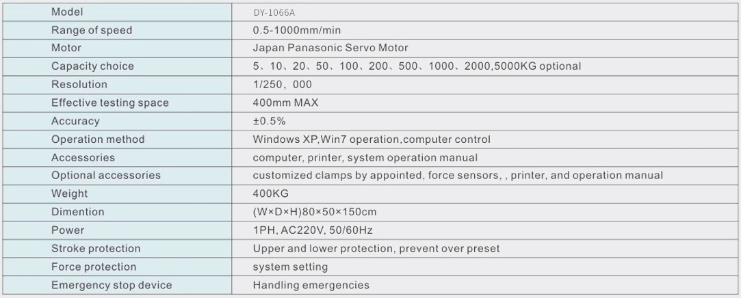 Uses:This machine also known as a materials testing machine , is applicable to testing tensile, compression,bending,peelshearing force, peeling force, modulus of elasticity,and elongation of materials, components, and finished product for metalplastic, rubber, textile, synthetic chemicals, wire and cable,leather,package,tape,film,solar cell,ect.
